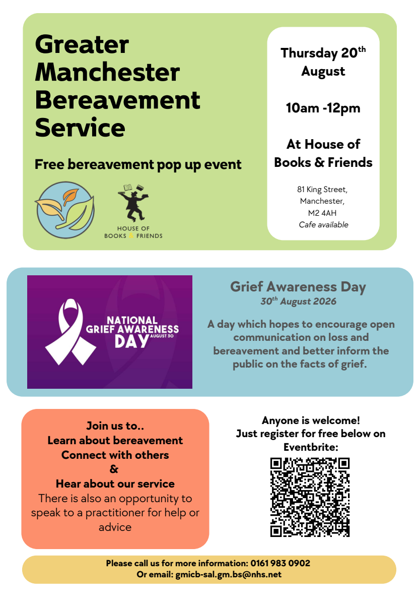 To mark Grief Awareness Day 2026, on Thursday 20 August, the Greater Manchester Bereavement Service will be hosting their pop up session at the House of Books & Friends from 10am – 12pm.
